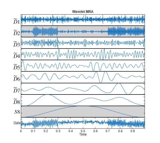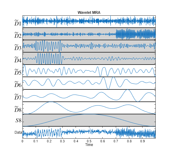 The wavelet MRA uses fixed functions called wavelets to separate the signal components. The kth wavelet MRA component, denoted by in the previous plot, can be regarded as a filtering of the signal into frequency bands of the form where is the sampling period, or sampling interval. The final smooth component, denoted in the plot by , where is the level of the MRA, captures the frequency band . The accuracy of this approximation depends on the wavelet used in the MRA. See [5] for detailed descriptions of wavelet and wavelet packet MRAs.