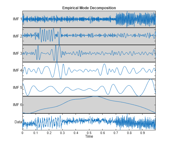 [imf_emd,resid_emd] = emd(x); helperMRAPlot(x,imf_emd,t,"emd","Empirical Mode Decomposition",[1 2 3 6])