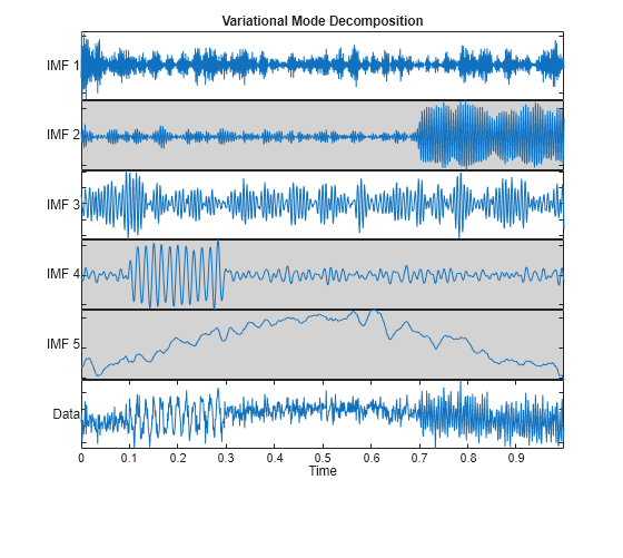 The key thing to note is that similar to the wavelet and EMD decompositions, VMD segregates the three components of interest into completely separate modes or into a small number of adjacent modes. All three techniques allow you to visualize signal components on the same time scale as the original signal.