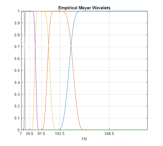 Nf = length(x)/2+1; cf = mean(info.FilterBank.Passbands,2); f = 0:Fs/length(x):Fs-Fs/length(x); clf ax = newplot; plot(ax,f(1:Nf),wfb(1:Nf,:)) ax.XTick = sort(cf.*Fs); ax.XTickLabel = ax.XTick; xlabel("Hz") grid on title("Empirical Meyer Wavelets")