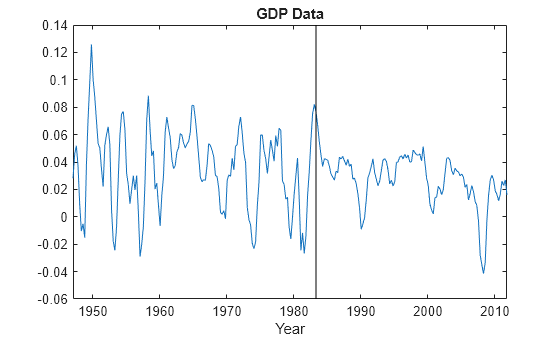 load GDPData figure plot(year,realgdp) hold on plot([year(146) year(146)],[-0.06 0.14],"k") title("GDP Data") xlabel("Year") hold off