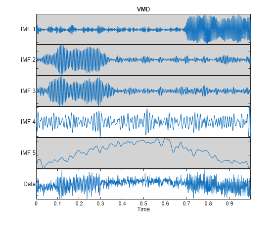 [imf_vmd,~,info_vmd] = vmd(x); helperMRAPlot(x,imf_vmd,t,"vmd","VMD",[1 2 3 5]);