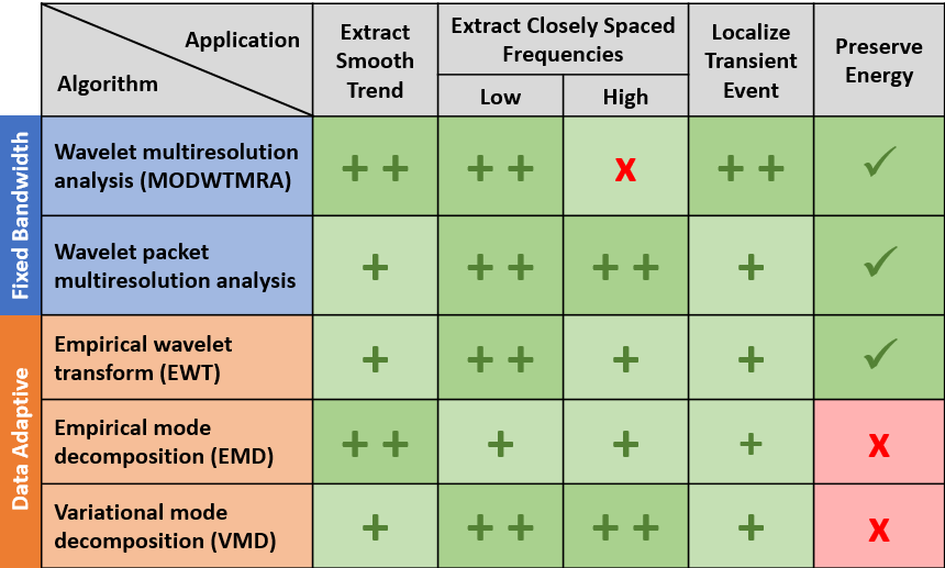 This example showed how multiresolution decomposition techniques such as wavelet, wavelet packet, empirical mode decomposition, empirical wavelet, and variational mode decomposition allow you to study signal components in relative isolation on the same time scale as the original data. Each technique has proven itself powerful in a number of applications. The example has given a few rules of thumb to get you started, but these should not be regarded as absolute. The following table recaps properties of the MRA techniques presented here along with some general rules of thumb. Two plusses denote a particular strength, one plus indicates that the technique is applicable, but not a particular strength. For a binary property like the preservation of energy in the analysis, a check mark indicates the technique has this property and an "x" indicates the property is absent.