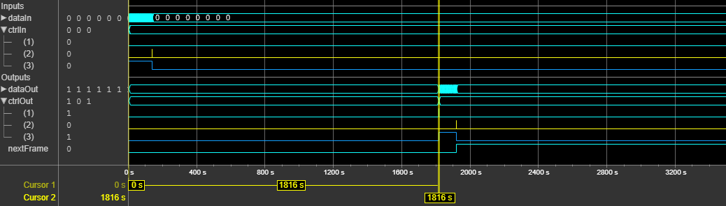 This figure shows a sample output and latency of the LDPC Decoder block for a 8-by-1 vector input when you use default settings for the block parameters. The latency of the block is 1816 clock cycles.