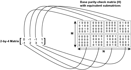 The block supports matrices with a circulant weight of 1. Each element in the parity-check matrix corresponds to a submatrix of size Z. The elements in the parity-check matrix must be in the range [–1, Z –1], where Z is the block size. In a parity-check matrix, –1 corresponds to a zero submatrix, 0 corresponds to an identity submatrix, 1 corresponds to an identity submatrix circularly shifted by one time, and n corresponds a submatrix circularly shifted by n times, where n is any value in the range [0, Z – 1].