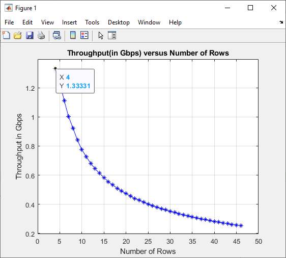 This plot shows the throughput versus the number of rows specified at the block input,