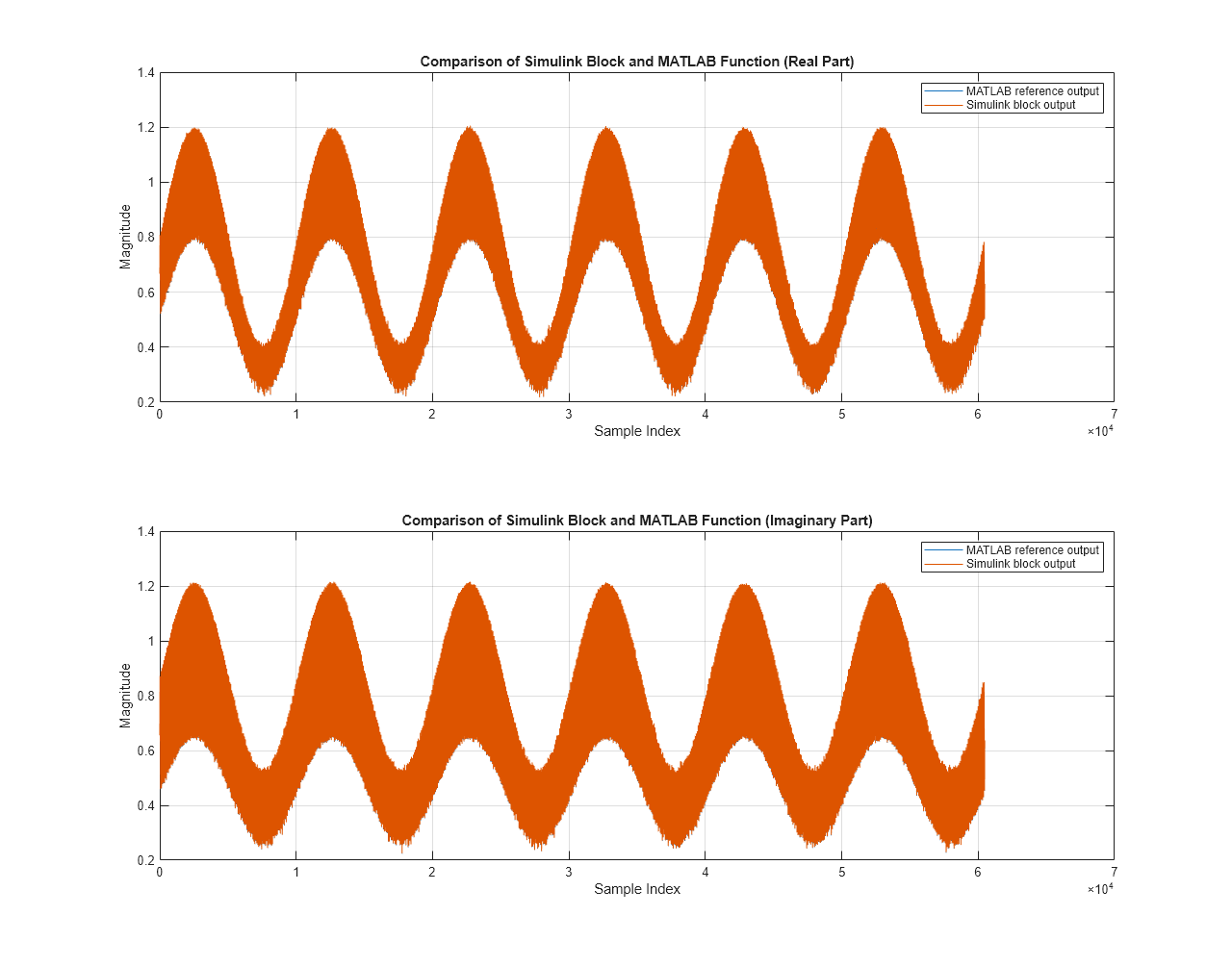 This figure shows a sample output of the OFDM Equalizer block when you
