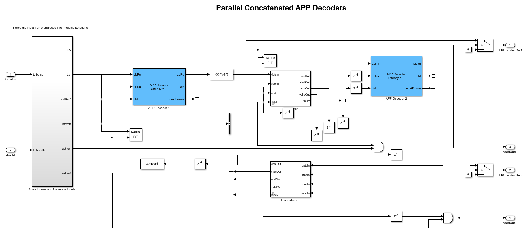 The following figure shows how the APP Decoder blocks are connected in parallel to build a turbo decoder. The output from the first decoder is interleaved and provided as an input to the second decoder and the output from the second decoder is de-interleaved and provided as an input to the first decoder forming a feedback loop. The Interleaver and Deinterleaver blocks are implemented based on the HDL Interleaver and Deinterleaver example. The Store Frame and Generate Inputs subsystem stores the frame and provides input to both the decoders based on the number of iterations. The stopTime value is adjusted so that the model runs for the specified number of frames, number of iterations, and frame length.