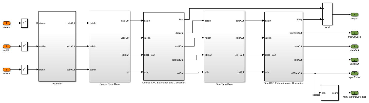 The example model accepts the received waveform as an input along with valid and start signals. The model returns a synchronized waveform as an output along with a valid signal. The other outputs in the example include a packet detected flag, a CFO estimate along with its valid and the number of packets detected as an output. CFO estimate is the sum of coarse CFO and fine CFO estimates. The wlanFrontEndInit script provides the input to the model. The wlanWaveformGenerator.m function in the script generates the VHT 20 MHz frame, which is passed through the TGac channel with a delay profile of Model A. The additive white Gaussian noise (AWGN) at 30 dB signal-to-noise ratio (SNR) is added with other channel impairments of a 10 kHz CFO and a timing offset of '25'.