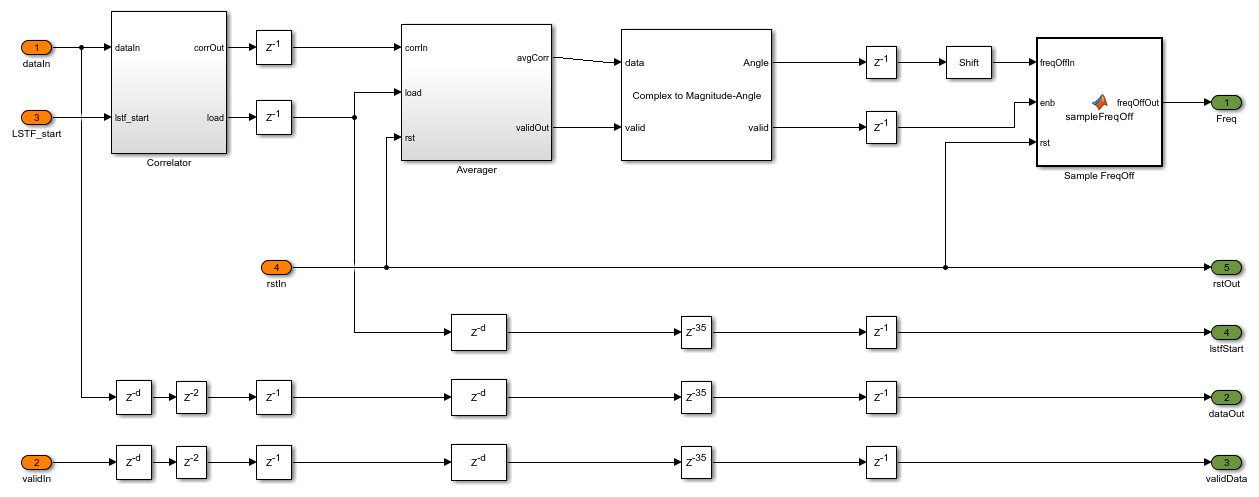 Considering the start of the packet from the Coarse Time Sync subsystem, Coarse CFO Estimation and Correction subsystem performs autocorrelation on the input using a L-STF and averages the calculated correlation metrics over a window of the L-STF duration. Then, the subsystem estimates the carrier frequency offset (CFO) by considering the angle of the resulted metric.