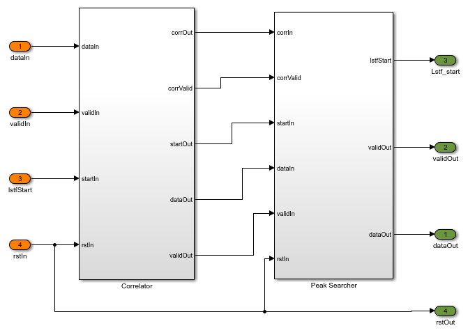 The coarse time synchronization algorithm implements a double sliding window for correlation as described in the MATLAB function wlanPacketDetect.m. The Coarse Time Sync subsystem uses the autocorrelation of legacy short training field (L-STF) symbols to return an estimated packet-start offset. The Peak Detector subsystem compares the correlation metrics with the energy of the signals and determines the start of the packet. In the next stage, the fine symbol timing detection refines this packet start estimate using the legacy long training field (L-LTF).