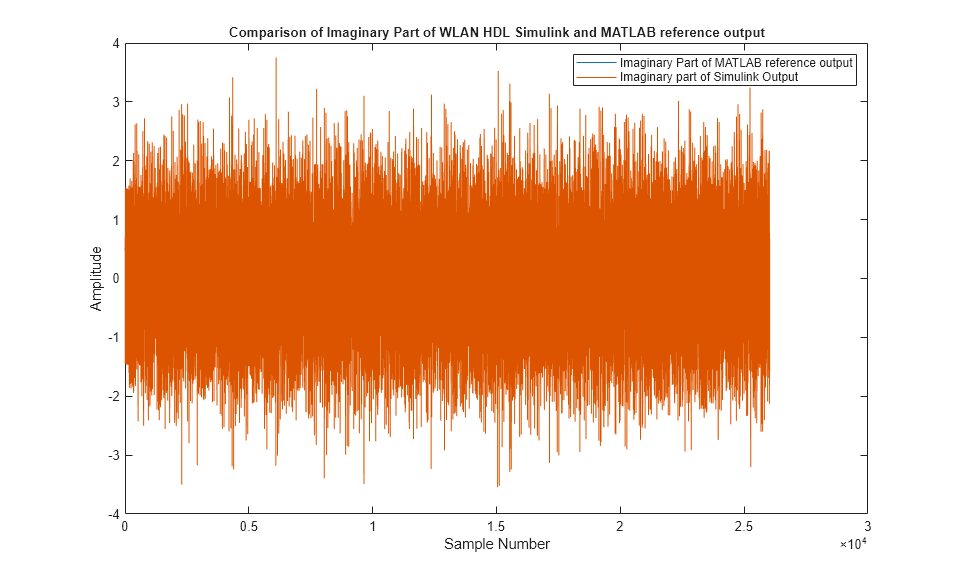 plot(real(matOut)); hold on; simOut = simOut(1:length(matOut)); plot(real(simOut)); title('Comparison of Real Part of WLAN HDL Simulink and MATLAB reference output','FontSize', 10); xlabel('Sample Number'); ylabel('Amplitude'); legend('Real Part of MATLAB reference output','Real part of Simulink output'); figure; plot(imag(matOut)); hold on; simOut = simOut(1:length(matOut)); plot(imag(simOut)); title('Comparison of Imaginary Part of WLAN HDL Simulink and MATLAB reference output','FontSize', 10); xlabel('Sample Number'); ylabel('Amplitude'); legend('Imaginary Part of MATLAB reference output','Imaginary part of Simulink Output');