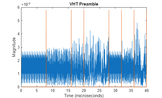 time = ((0:double(numSamples)-1)/fs)*1e6; peak = 1.2*max(abs(rxPPDU(1:numSamples))); fieldMarkers = zeros(numSamples,1); fieldMarkers(fieldInd.LSTF(2)-1,1) = peak; fieldMarkers(fieldInd.LLTF(2)-1,1) = peak; fieldMarkers(fieldInd.LSIG(2)-1,1) = peak; fieldMarkers(fieldInd.VHTSIGA(2)-1,1) = peak; fieldMarkers(fieldInd.VHTSTF(2)-1,1) = peak; fieldMarkers(fieldInd.VHTLTF(2)-1,1) = peak; fieldMarkers(fieldInd.VHTSIGB(2)-1,1) = peak; plot(time,abs(rxPPDU(1:numSamples)),time,fieldMarkers) xlabel ('Time (microseconds)') ylabel('Magnitude') title('VHT Preamble')
