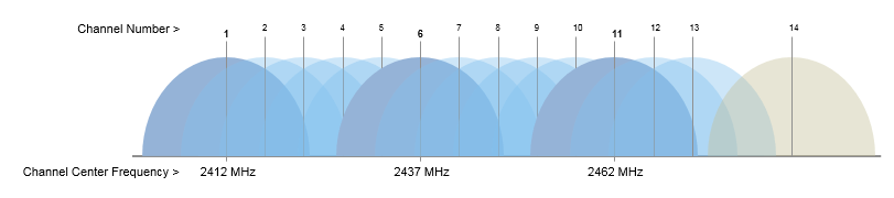 Because WLAN channel bandwidths are greater than 5 MHz, cross-channel interference limits the number of designated usable channels. Access point deployments manage interference from neighboring cells by operating on nonoverlapping channels. In the United States, the 2.4 GHz band designated usable nonoverlapping channels are 1, 6, and 11. This figure shows overlap for channels 1–14 in the 2.4 GHz band.