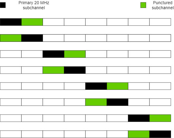 In a 160 MHz transmission, you can signal a punctured 20 or 40 MHz subchannel. You can only signal a punctured 20 MHz subchannel in the 40 MHz subchannel containing the primary 20 MHz subchannel, as shown in this figure.