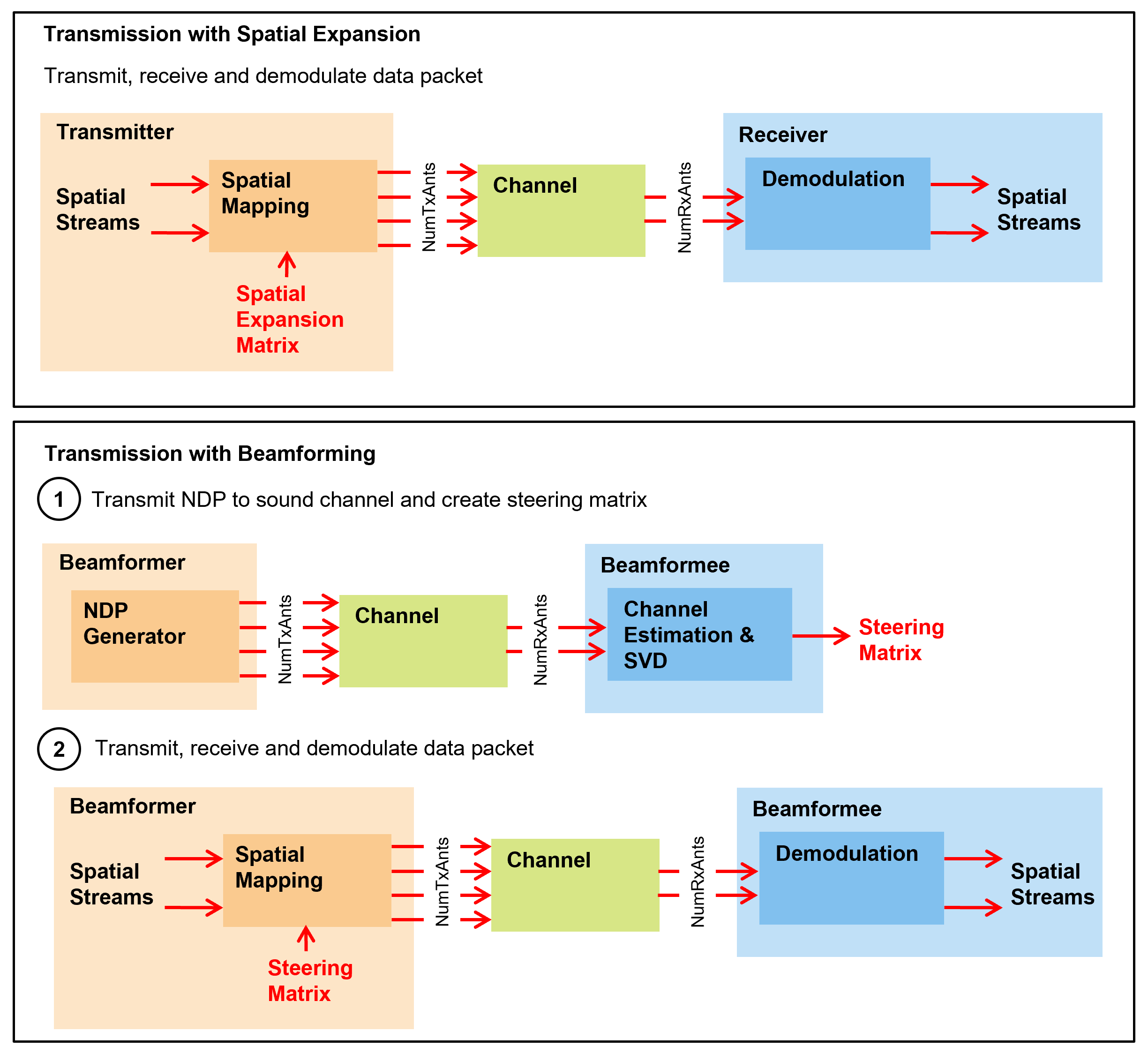This example demonstrates that if a receiver is capable of being a beamformee, the SNR can potentially be improved when a transmission is beamformed compared to a spatial expansion transmission. The increase in received power when using beamforming can lead to more reliable demodulation or potentially even a higher order modulation and coding scheme to be used for the transmission.