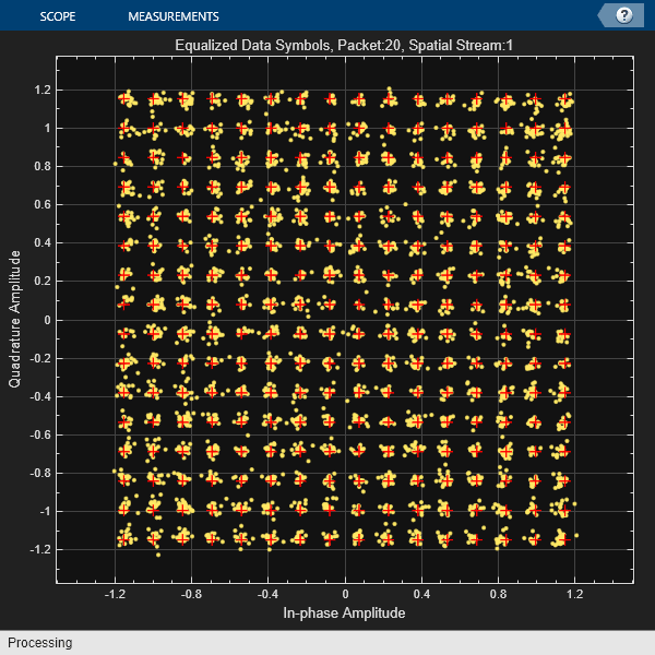 This section detects, synchronizes, and extracts each packet in rxWaveform, then measures the EVM, spectral flatness, and IQ imbalance. For each packet, the example performs these steps: