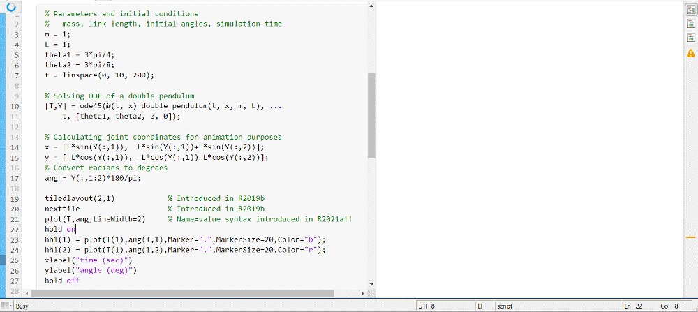 Educators make their course material more interactive, promote self-directed learning, and increase student engagement through Live Editor. One of the advantages it offers is animated figures in your Live scripts. This can help students better understand dynamic systems such as the motion of a projectile or a double pendulum through visualization. With R2021a, you can now replay animations and explore individual frames without having to re-run the code.