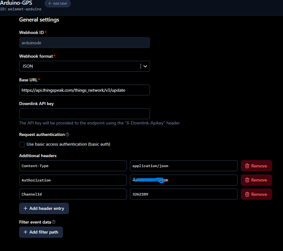 - Set up a Webhook in TTN that sends the decoded payload fields to the ThingSpeak API endpoint