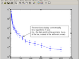 ERRORBARLOG(X,Y,E,...) plots the graph of vector X vs. vector Y with a logarithmic Y-axis, using symmetrical bars about the data points, ie: the bars are such that Y is the geometric mean (instead of arithmetic mean) of the lower and upper bars. The total length of the error bar is 2E.