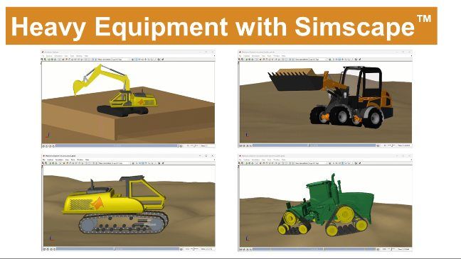 Simscape enables engineers to optimize the design of heavy equipment, including excavators, wheel loaders, tractors, and other machines for construction or agricultural tasks. You can tailor Simscape models to your exact design and explore the entire design space. Use the examples linked from this page to refine design requirements, design control algorithms, and test controller software without relying on hardware prototypes. MATLAB apps help you configure models to test for compliance with government regulations.